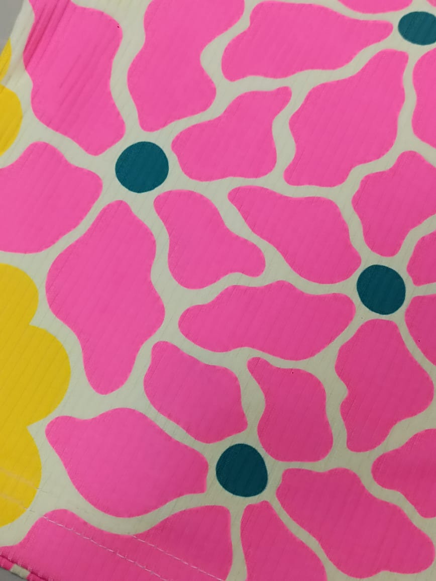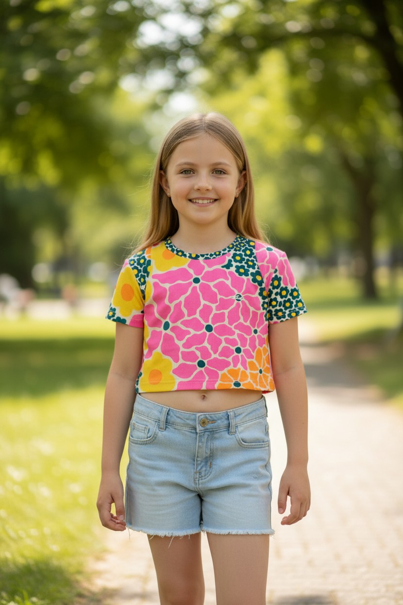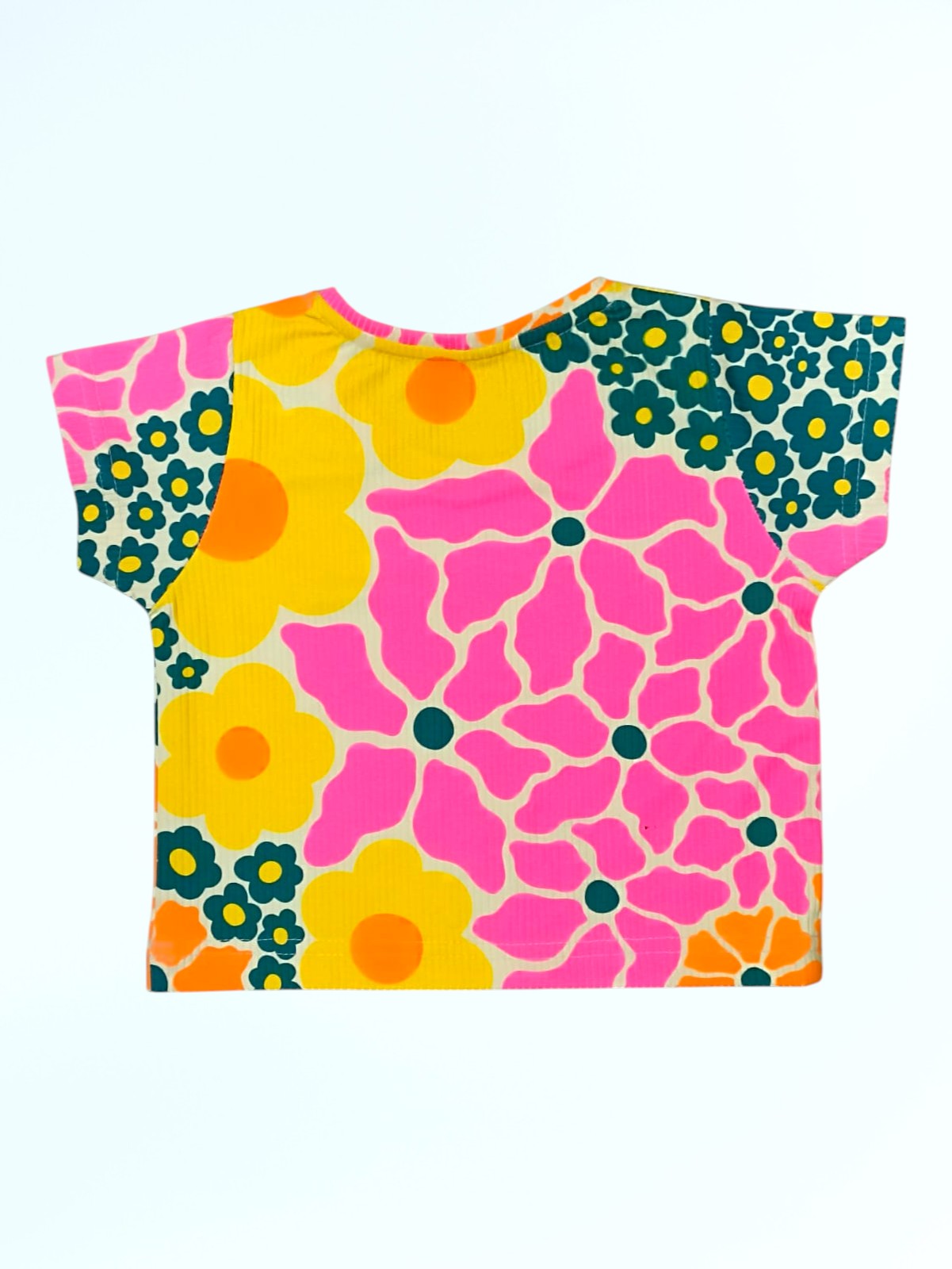 Designed with a lively mix of pink, yellow, green, and orange flower patterns, this top brings a fun, cheerful look perfect for everyday or outdoor adventures.