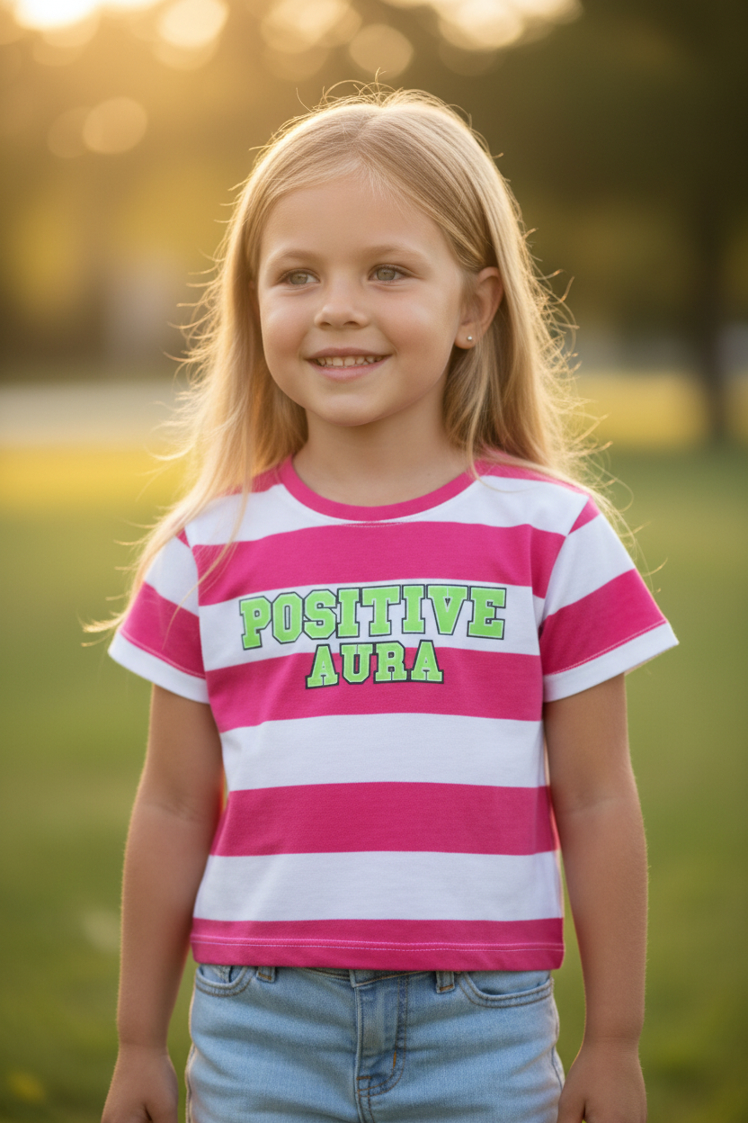 Bright, cheerful and super comfortable — this striped round-neck T-shirt is designed for everyday fun. The trendy stripe pattern paired with a positive slogan adds a playful yet stylish touch, making it perfect for casual outings, playtime, or daily wear.